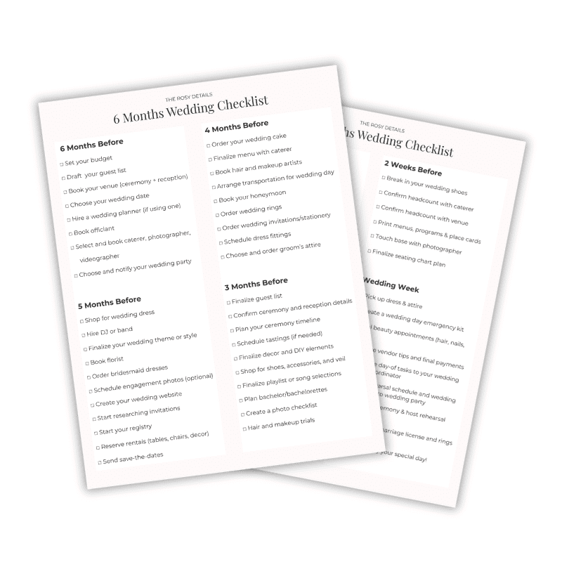 Prefer the 6 months wedding planning checklist version you can print, check off, and stick to your fridge (or wedding planner)? No signup needed!